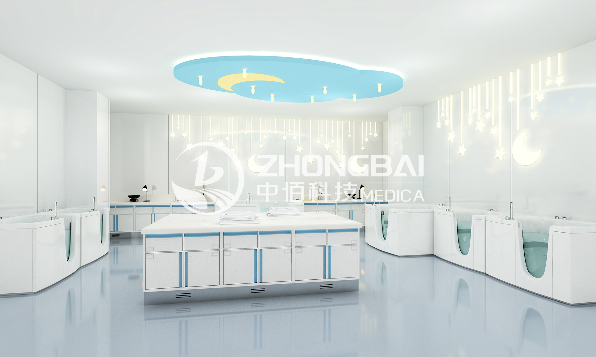洗嬰室需要結合新生兒護理工作的模式和環境,進行整體設計,注重安全、預防感染,營造符合嬰幼兒特征的活潑可愛、安全溫馨的場景氛圍。